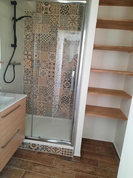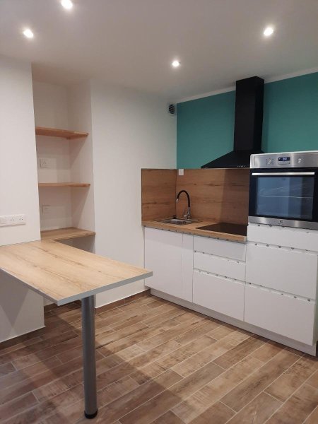 Un séjour avec placard, une cuisine ouverte équipée ( plaque de cuisson, hotte, four) une pièce noire de 9.10 m2 avec placard pouvant servir de chambre, une salle d'eau avec wc.