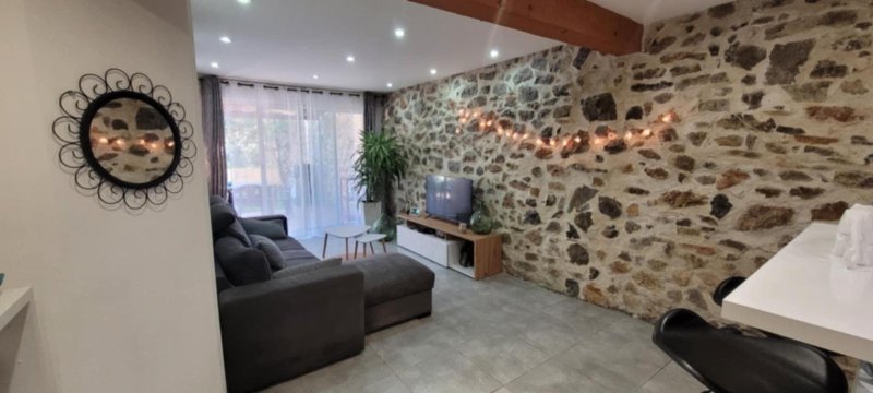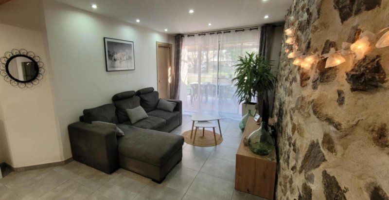 Une cuisine aménagée et semi équipée (four, plaque de cuisson, hotte et lave vaisselle), avec un cellier ouverte sur le séjour, séjour donnant accès a une belle terrasse et au jardinet, deux chambres dont une avec placard, une salle d'eau avec WC.