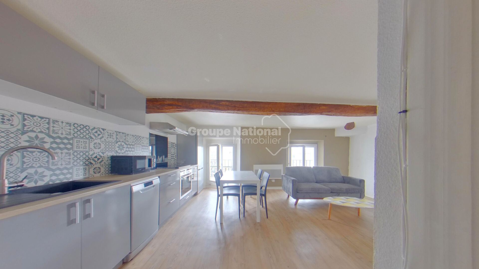 Le logement se compose d'une cuisine aménagée et équipée (hotte, plaque de cuisson mixte ) ouverte sur un séjour, une chambre comprenant un placard incorporé, une salle d'eau avec douche, un sèche serviette et des WC indépendants.