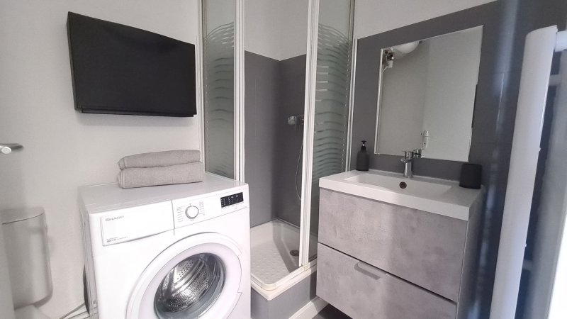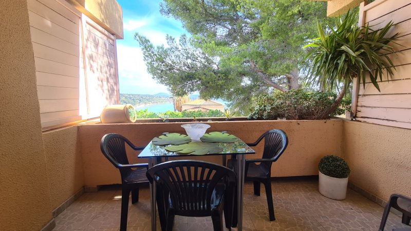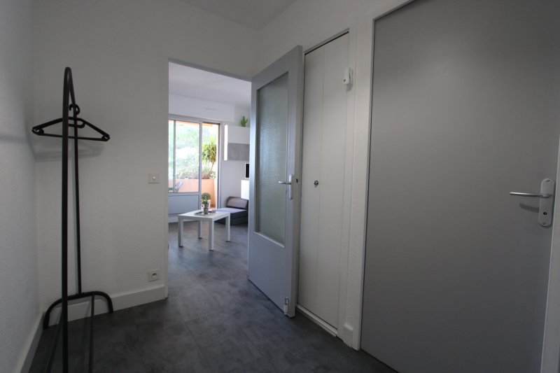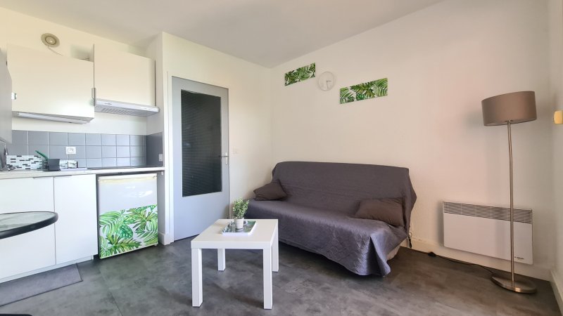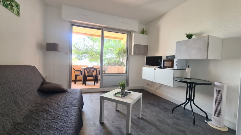 Quartier de l'Escourche - Résidence sécurisée au calme absolu, Studio meublé de 19m2 au 2ème étage (sans ascenseur) rénové (peintures, cuisine, salle d'eau) comprenant : une entrée avec placard, une pièce principale avec coin kitchenette, l'ensemble donnant sur une terrasse de 5.96m2 avec VUE MER, salle d'eau avec wc. Parking privatif. Accès piétons pour rejoindre le centre-ville et les plages. Disponible le 01/10/2025.