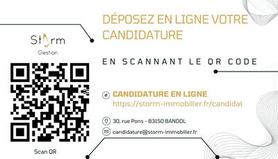 Pour déposer rapidement votre dossier en ligne, merci de vous connecter sur le lien suivant : https://public.storm-immobilier.fr/candidat ou le QR code en photo ou en vous connectant directement sur notre site Internet.