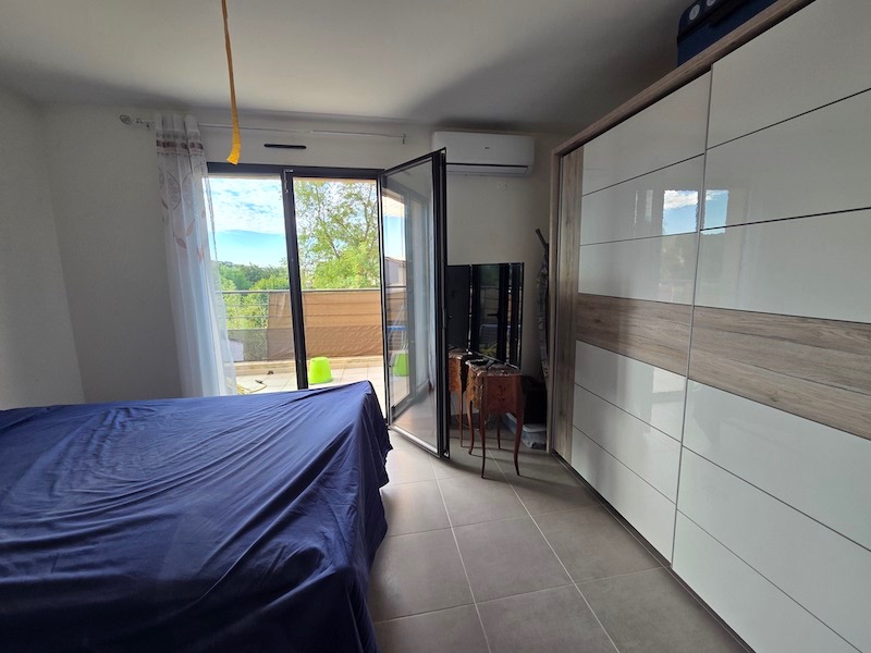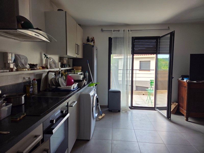 Appartement récent type 2 d'une superficie de 44 m2 environ, au 1er étage sans asceneur, comprenant : entrée avec placard, pièce principale avec coin cuisine aménagé et équipée (plaque+hotte+four), une chambre, terrasse, salle de bains avec WC.