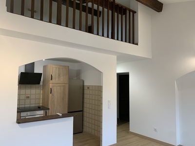 Centre village, en dernier étage d'immeuble, duplex de type T2 bis entièrement rénové avec balcon. Il se compose d'une entrée avec séjour (accès balcon), d'une cuisine équipée, d'une chambre, d'une salle d'eau et d'un wc indépendant, en étage, une pièce sous combles à usage bureau ou dressing, une mezzanine. Loué meublé - Disponible immédiatement - DPE C/A