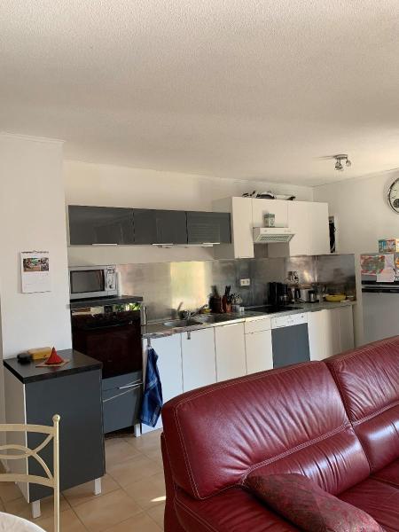 Une cuisine aménagée ouverte sur le séjour très lumineux, un couloir équipé d'un placard desservant 2 chambres avec placard et accès à la terrasse, une salle de bain et un WC séparé.