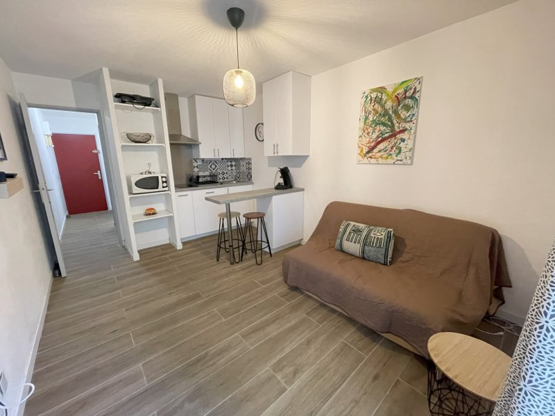 LOCATION ANNUELLE MEUBLEE, Quartier de la Favière, à moins de 500m de la plage et proche commerces, très beau studio-cabine rénové de 20m2, situé au 2ème étage sans ascenseur d'une résidence sécurisée avec place de parking privative. Composé d'une cabine à l'entrée avec lits superposés et placard, une salle d'eau avec WC et lave-linge, un séjour avec cuisine équipée ouvrant sur un joli balcon d'environ 7m2. Disponible au 1er Mars 2026. Les informations sur les risques auxquels ce bien est exposé sont disponibles sur le site Géorisques : georisques. gouv. fr