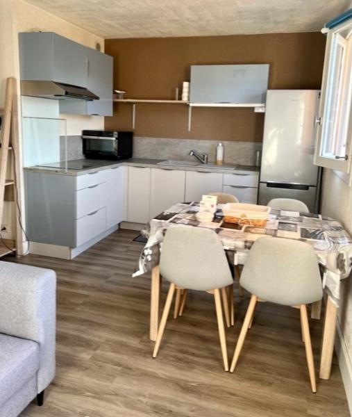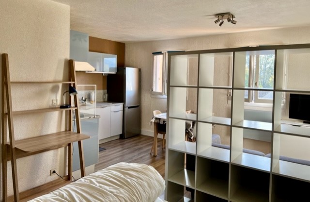 Une pièce principale avec une cuisine aménagée et équipée, une salle de bains avec un WC.