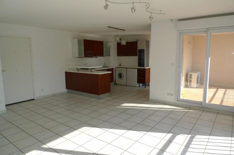 Une cuisine aménagée et semi équipée (four, plaque de cuisson, lave-vaisselle, hotte) ouverte sur un spacieux séjour, une buanderie, une terrasse de 10.93m2, un couloir desservant un WC séparé, une salle de bains et deux chambres avec placards.