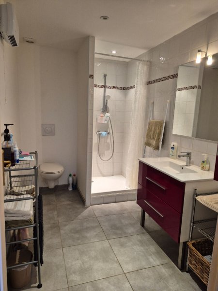 une salle d'eau avec WC, un WC indépendant. À l'étage : un séjour lumineux avec une cuisine ouverte, aménagée, équipée et climatisée, une agréable terrasse pour profiter de l'extérieur.
