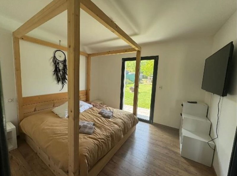 L'intérieur est lumineux et moderne, avec une cuisine ouverte aménagée et équipée, parfaite pour les amateurs de cuisine. Le chauffage est assuré par une pompe à chaleur air/air, complété par un poêle à granulés pour des soirées chaleureuses. Vous trouverez également une salle d'eau et un WC séparé.