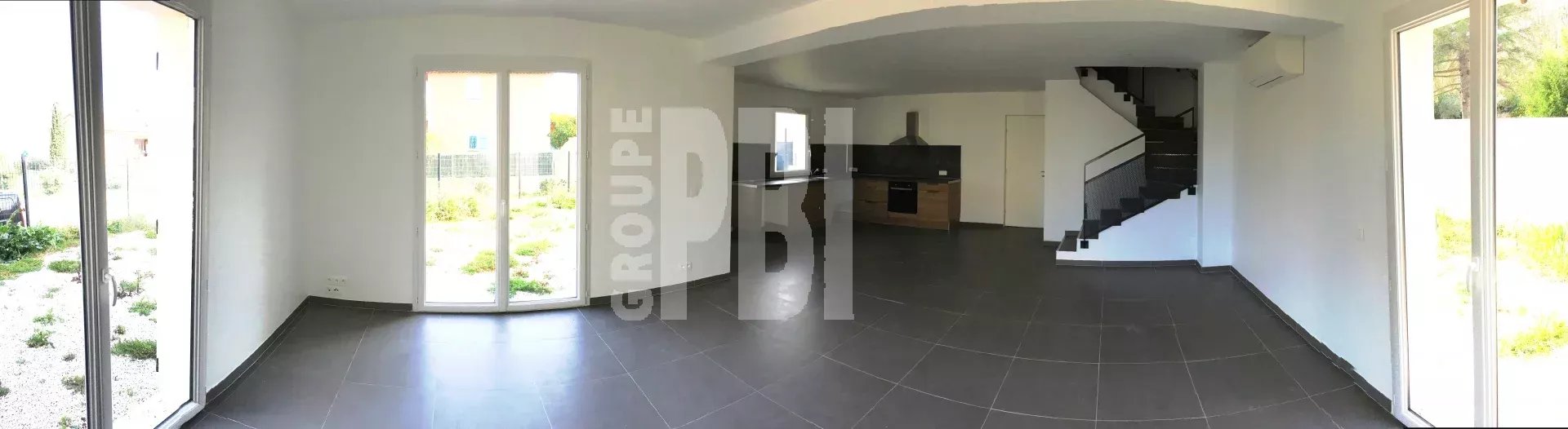 Villa récente (2020) élevée d'un étage sur rez-de-chaussée comprenant en rdc : un séjour avec cuisine ouverte, un WC, Jardin et terrasse.