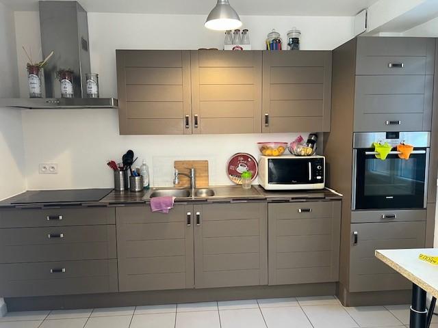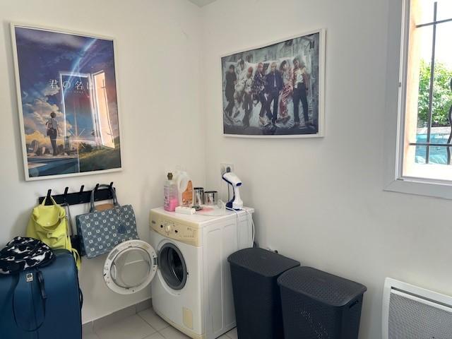 Une entrée avec placard, un WC séparé, une cuisine aménagée et semi équipée (plaque, four, lave vaisselle et hotte) ouverte sur la salle à manger/séjour, une buanderie
