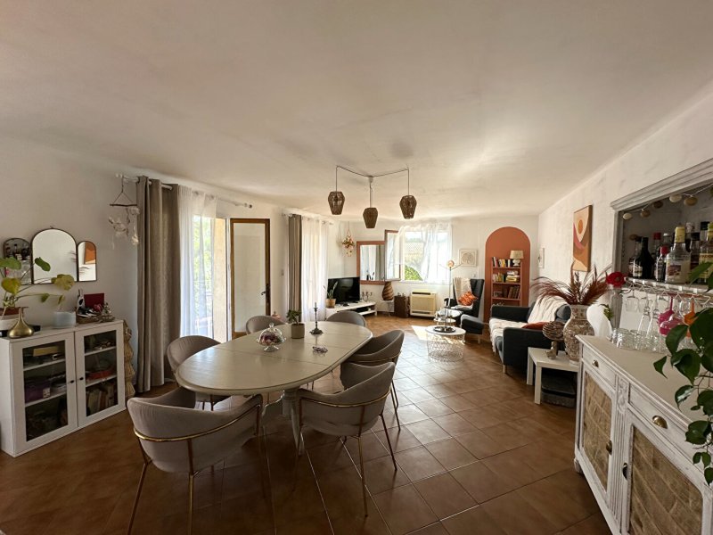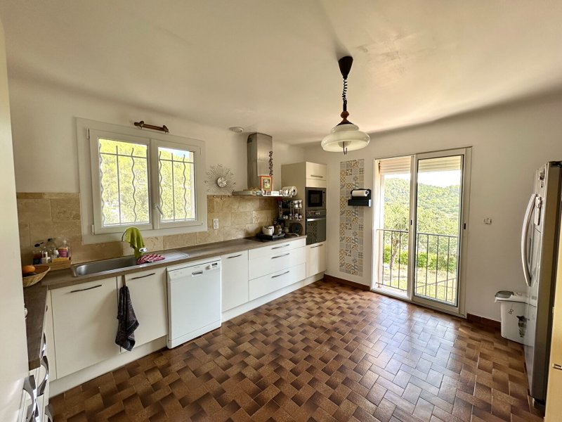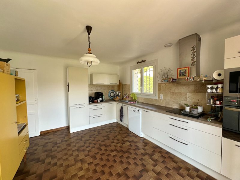 Grande maison à l'étage d'environ 104 m² avec cuisine équipée (plaque à induction, four, frigo, lave-vaisselle, machine à laver, électroménagers divers etc.), Grand salon lumineux et confortable avec TV, terrasse avec une magnifique vue. Jardin arboré, portail et aire de stationnement.