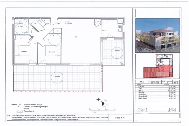 Cet appartement dispose d'un hall d'entrée, agrémenté de rangements, ouvert sur le salon et le coin nuit. Il se compose d'un grand séjour (27.67m²) très lumineux donnant accès à une terrasse, une cuisine américaine qui mène au balcon d'environ 8m². L'espace nuit divisé en deux chambres avec placard, une salle d'eau et un WC indépendant. Les deux chambres ont un accès direct à la terrasse d'environ 35m².