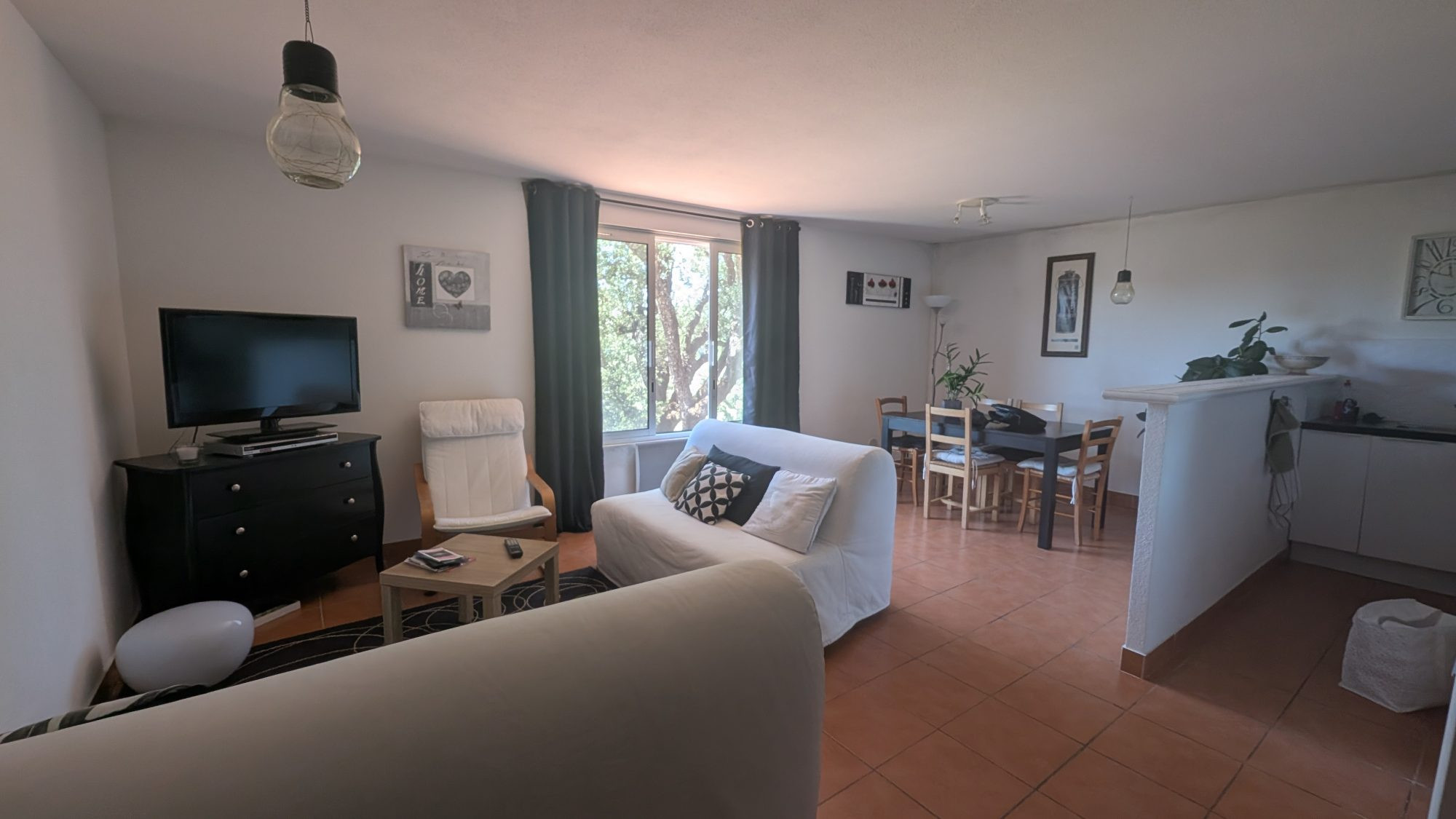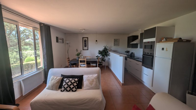 EN EXCLUSIVITÉ ! À vendre à Flassans-sur-Issole, dans une résidence de standing construite en 1996, calme et sécurisée, avec piscine, terrain de tennis et boulodrome, charmant appartement T2 de 52,8 m² habitables, situé en rez-de-chaussée. Il se compose d'une pièce de vie avec cuisine ouverte aménagée et très bien équipée (réfrigérateur, lave-vaisselle, micro-ondes, plaques, hotte), d'une chambre avec rangements et d'une salle de bains avec toilette. Vous profiterez d'une terrasse privative d'environ 18 m², d'un stationnement facile sur le grand parking commun, le tout avec une belle vue dégagée sur la campagne. Ce bien offre de belles prestations : fenêtres en double vitrage, chauffage électrique, et un DPE en C, gage d'une bonne isolation. Fraîchement repeint, il ne nécessite pas de travaux, vous pouvez poser vos valises ou louer clefs en main. Idéal en résidence principale, pied-à-terre ou investissement locatif, cet appartement séduit par son environnement paisible et ses faibles charges, tout en étant proche des commerces des villages de Gonfaron et de Flassans. Les informations sur les risques auxquels ce bien est exposé sont disponibles sur le site Géorisques : www.georisques.gouv.fr. Honoraires à la charge du vendeur. Dans une copropriété de 16 lots. Aucune procédure n'est en cours. Classe énergie C, Classe climat A Montant estimé des dépenses annuelles d'énergie pour un usage standard : entre 658.00 et 890.00 sur les années 2021, 2022 et 2023 (abonnements compris). Les informations sur les risques auxquels ce bien est exposé sont disponibles sur le site Géorisques : georisques.gouv.fr.