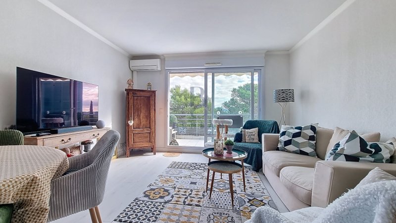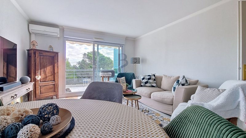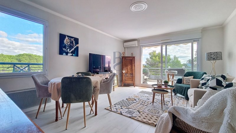 Il se compose d'un spacieux séjour/salle à manger climatisé ouvrant sur une grande terrasse avec vue dégagée, d'une cuisine équipée, de deux chambres avec placards, d'une salle de bains et de WC indépendants.