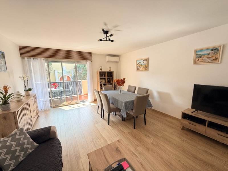 Dans petite résidence à PORT FREJUS, appartement 3 pièces traversant d'environ 72m2 composé d'une entrée avec placard, une cuisine équipée sur loggia, un séjour sur terrasse, deux chambres, une salle d'eau, un WC indépendant. Parking privatif. Garage.