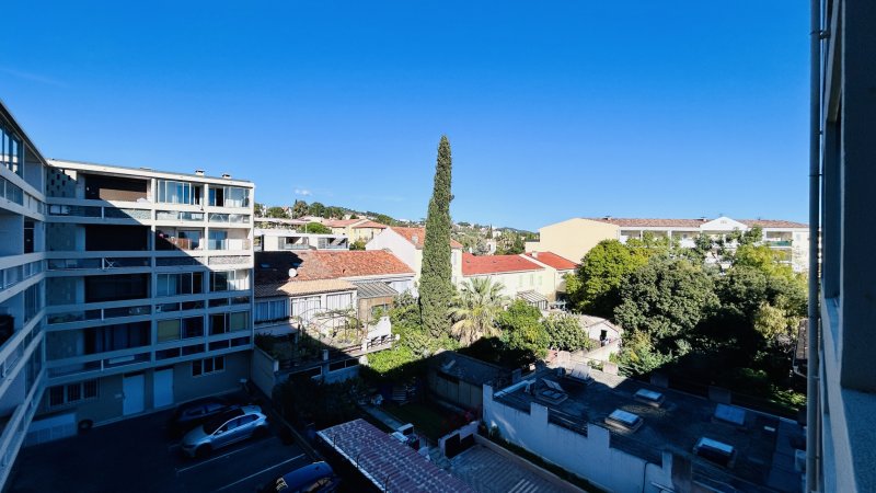 HYERES Proche Centre Ville EST - Dans une résidence entretenue avec ascenseur, située au calme tout en étant à proximité du Lycée Maintenon et à 10mn à pied des commerces du centre-ville. Appartement de Type 2, situé au 3ème étage avec ascenseur, composé d'un hall d'entrée avec rangement desservant un séjour donnant sur balcon de 7.5m2, cuisine semi séparée, une chambre avec placard donnant sur balcon, dressing, une salle de bains et wc séparée + Une cave en sous-sol. Stationnement aisé grâce à un grand parking situé face à la résidence. Idéal premier achat !