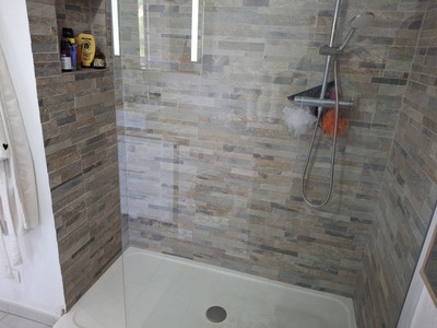 Une vaste salle d'eau fonctionnelle avec cabine de douche, meuble vasque, miroir, WC ainsi que d'un placard offrant un espace de rangement pratique.
