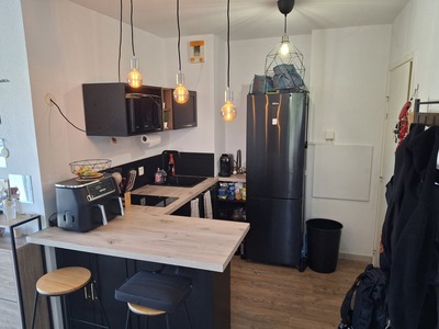 Ce bien se compose d'un bel espace séjour avec cuisine ouverte aménagée et équipée (plaques induction, rangements hauts et bas, évier), le tout, agrémenté de parquet,