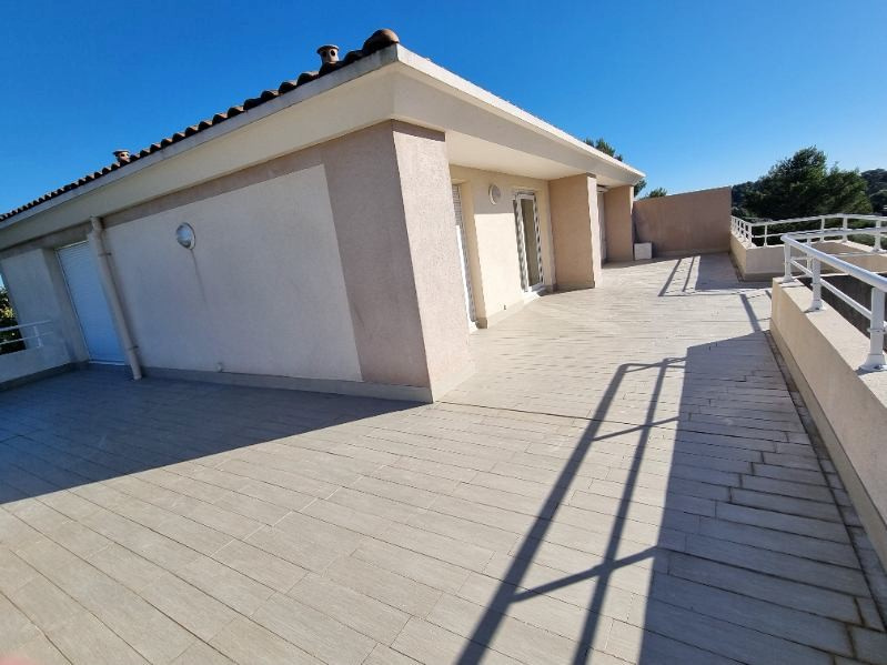 RARE à LA GARDE dans une petite copropriété de 2008 (14 lots) située dans un écrin de verdure et au calme, un spacieux appartement T5 en toit terrasse au 2ème et dernier étage avec ascenseur. Il développe 113m2 habitable + 120m2 de terrasses. Il se compose d'un hall d'entrée ouvant sur une spacieuse pièce séjour-salle à manger / cuisine, soit 45m2 avec accès sur terrasse et vue dégagée, un dégagement, une salle de douche, WC, dressing aménagé, 2 chambres + 1 suite avec salle de bains (baignoire + douche), une deuxième terrasse. Très lumineux, il dispose de belles ouvertures avec volets roulants électriques, fenêtre en P.V.C. double vitrage. Un garage en sous-sol d'env. 25m2. Charges mensuelles: 145EUR dont eau, ascenseur, entretien des communs et espaces verts. Prix: 580 000EUR Votre contact: Dominique HOFFMANN 07.60.51.46.11. Agence CAP'immo La Garde.