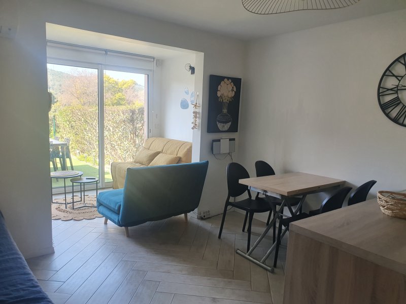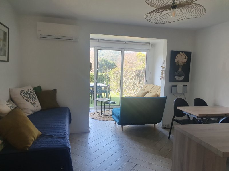 Dans une copropriété sécurisée et arborée sur la Commune d'Agay proche plage bel appartement T2 en rez de jardin. Cet appartement de 36m2 habitables (29,10m2 carrez) entièrement refait à neuf comprend un hall ,une pièce à vivre avec coin cuisine equipée, un salon ouvrant sur un jardinet privatif avec vue sur l'étang une chambre, une salle d'eau avec wc. Climatisation, volets électriques, store électrique vous pourrait profiter du calme et de la proximité de la plage. 10minutes du golf de valescure et de st Raphael