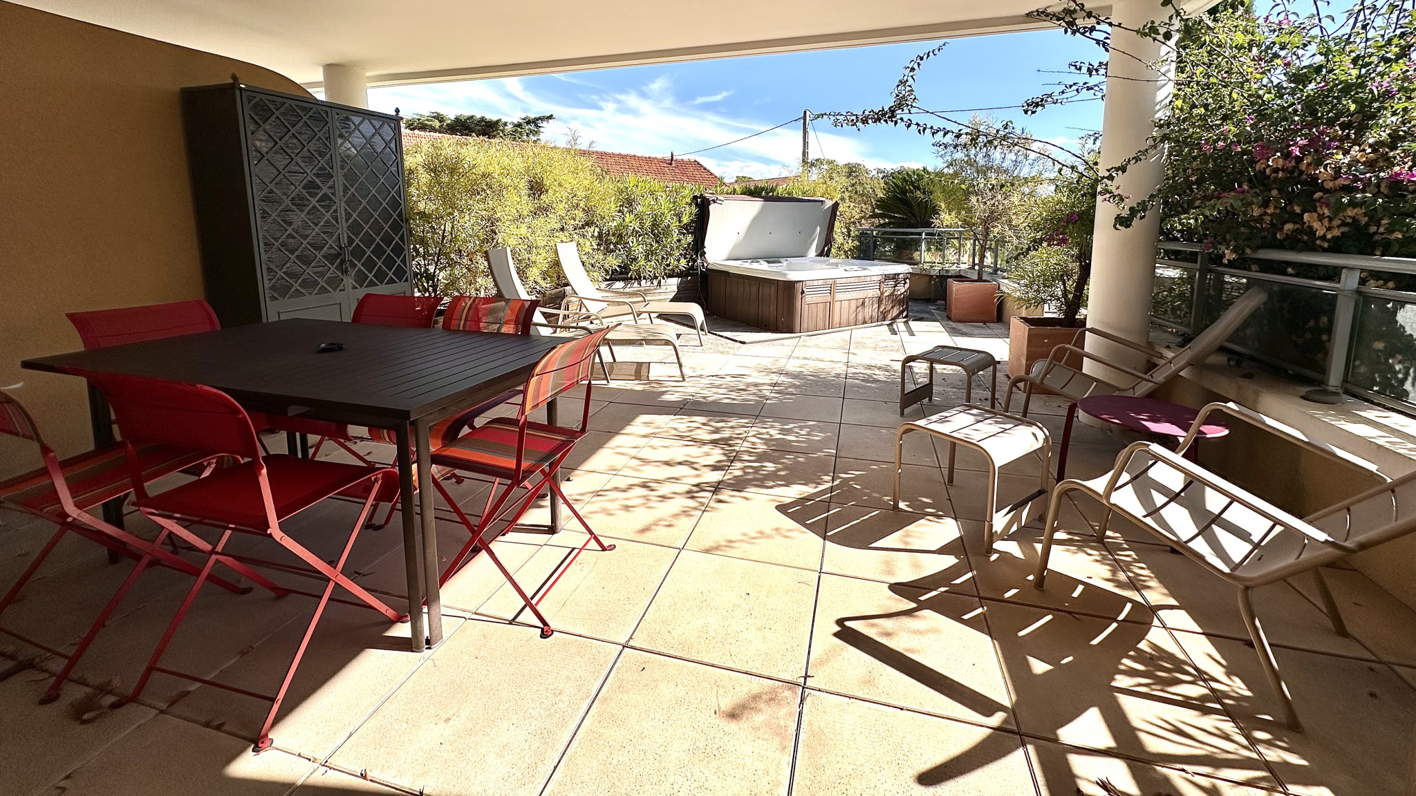 Découvrez cet agréable appartement de 47 m2, situé dans une résidence récente et sécurisée, en position dominante au-dessus du centre-ville de Bandol. Il se compose d'un lumineux salon-séjour avec cuisine ouverte, donnant sur une superbe terrasse plein sud de 50 m2, équipée d'un jacuzzi et offrant un accès à un jardin privatif de 40 m2. La partie nuit comprend une belle chambre ensoleillée avec terrasse privative, une salle d'eau moderne et un WC indépendant. L'accès à l'appartement se fait de plain-pied, et un ascenseur permet de rejoindre le sous-sol, où se trouve un garage double vendu avec le bien. La résidence se situe à seulement 5 minutes du port et du centre-ville, dans un environnement calme et verdoyant.