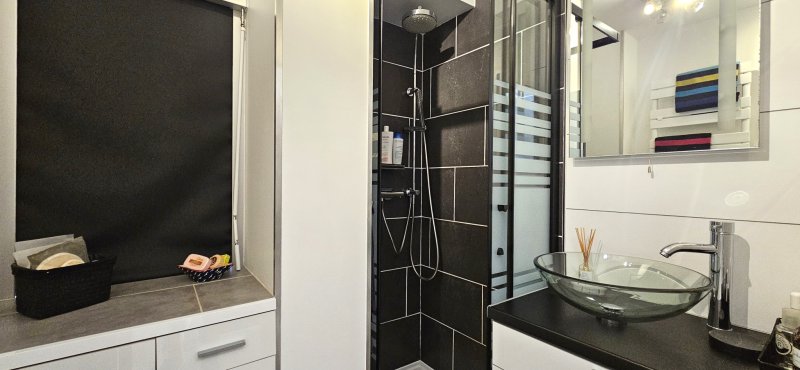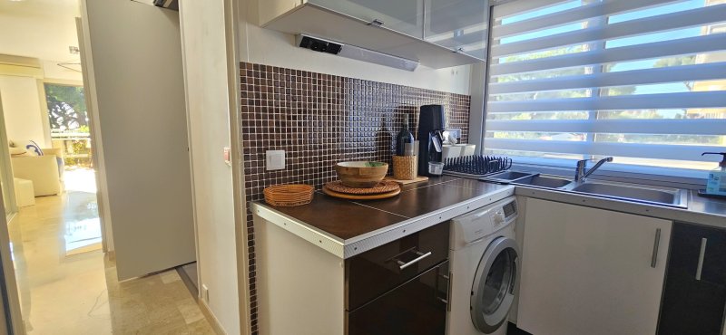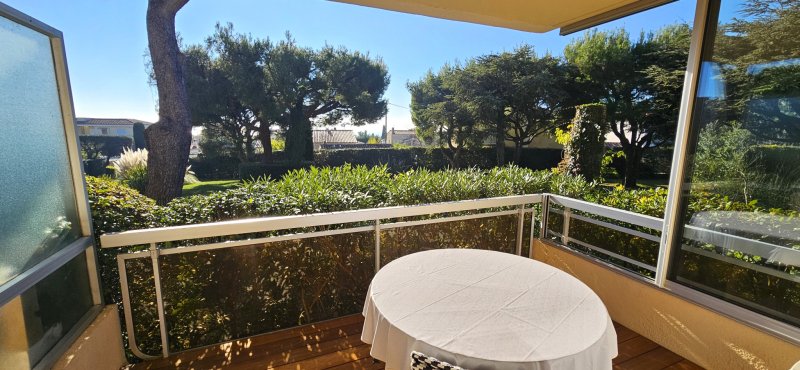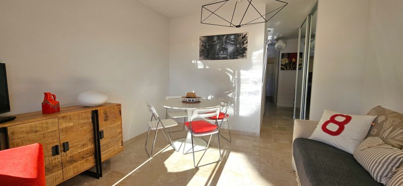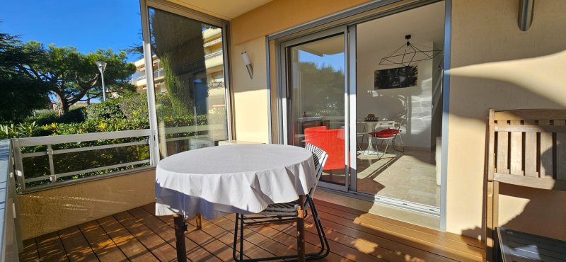 Dans une résidence fermée et sécurisée avec gardienne, ce grand studio transformé en véritable type 2 séduit par sa rénovation complète réalisée avec goût et soin. L'appartement offre un intérieur confortable et lumineux, équipé de la climatisation et du double vitrage, garantissant un excellent confort de vie en toute saison. La pièce de vie bénéficie d'une belle ouverture sur l'extérieur et d'une vue dégagée sur le parc arboré de la copropriété, avec de jolis aperçus sur la mer qui apportent une atmosphère particulièrement agréable. Exposé plein Sud, le logement profite d'un ensoleillement optimal tout au long de la journée. Vous apprécierez tout particulièrement la terrasse couverte de 9 m2 en bois marin, à l'abri du vent, idéale pour se détendre ou recevoir, dans un environnement calme et verdoyant. Une place de parking privative ainsi qu'une cave viennent compléter ce bien. Un appartement clé en main, parfaitement adapté aussi bien pour une résidence principale, un pied-à-terre ou un investissement locatif de qualité.