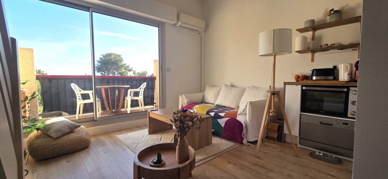 Dans une petite résidence au calme, à seulement 10 minutes du centre-ville, avec espaces verts, immeuble entièrement ravalé et parties communes rénovées récemment. Situé au 2ème et dernier étage, ce duplex de 34 m2, exposé plein Sud, a été entièrement rénové avec goût. Il se compose d'une entrée avec placard, d'une agréable pièce de vie avec cuisine ouverte donnant sur une terrasse plein Sud avec vue mer, ainsi que d'une salle d'eau avec WC. À l'étage : une grande chambre avec nombreux rangements. Belle hauteur sous plafond offrant une sensation d'espace, double vitrage et climatisation dans le séjour et la chambre.