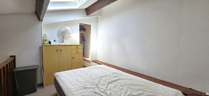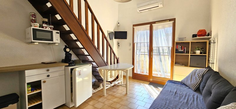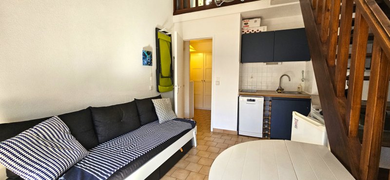 Appartement en hypercentre, au deuxième et dernier étage, idéalement situé entre le port et la célèbre plage de Renécros. Il se compose d'une entrée avec possibilité d'aménager un coin nuit, d'une salle de bain avec WC, ainsi que d'un placard de rangement. Le séjour, avec coin cuisine, s'ouvre sur un balcon orienté plein Ouest, offrant une belle luminosité. Un espace nuit en mezzanine avec dressing complète ce bien. Appartement climatisé.