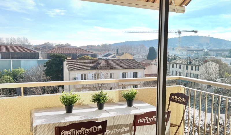 Six-Fours-Les Plages - Appartement rénové vendu meublé - lumineux et rénové avec climatisation neuve - Dernier étage - Le séjour et la chambre sont ouverts sur un large balcon avec vue sur la montagne ainsi que la place principale de Six-Fours remplie de charme - Kitchenette équipée - Salle d'eau - wc séparés - Grenier - Ascenseur - 6 marches