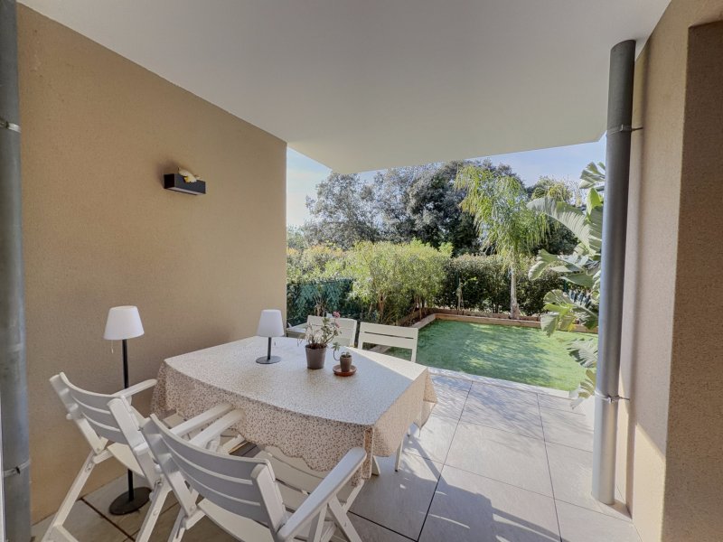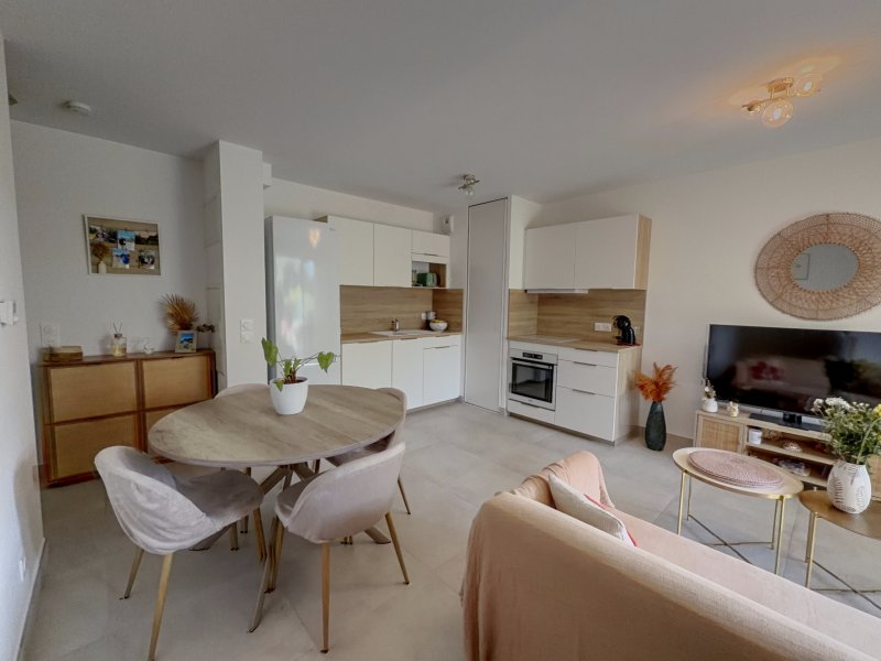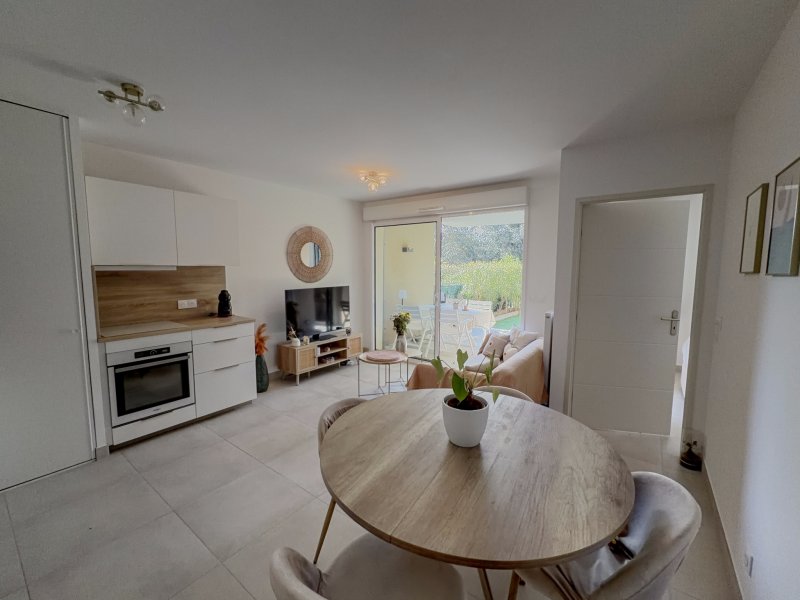 Situé à 1,5 km env. du bord de mer, au sein d'une résidence récente et sécurisée, découvrez ce bel appartement type 2 soigné de 37m2, présenté dans un état irréprochable. Il offre un espace de vie confortable avec cuisine entièrement équipée, une chambre disposant d'un grand placard, ainsi qu'une salle d'eau avec wc. Son véritable atout réside dans son bel extérieur : une terrasse abritée de 8 m2 prolongée par un jardin de 38 m2, offrant un cadre calme et verdoyant particulièrement agréable. Possibilité d'acquérir un garage en supplément.