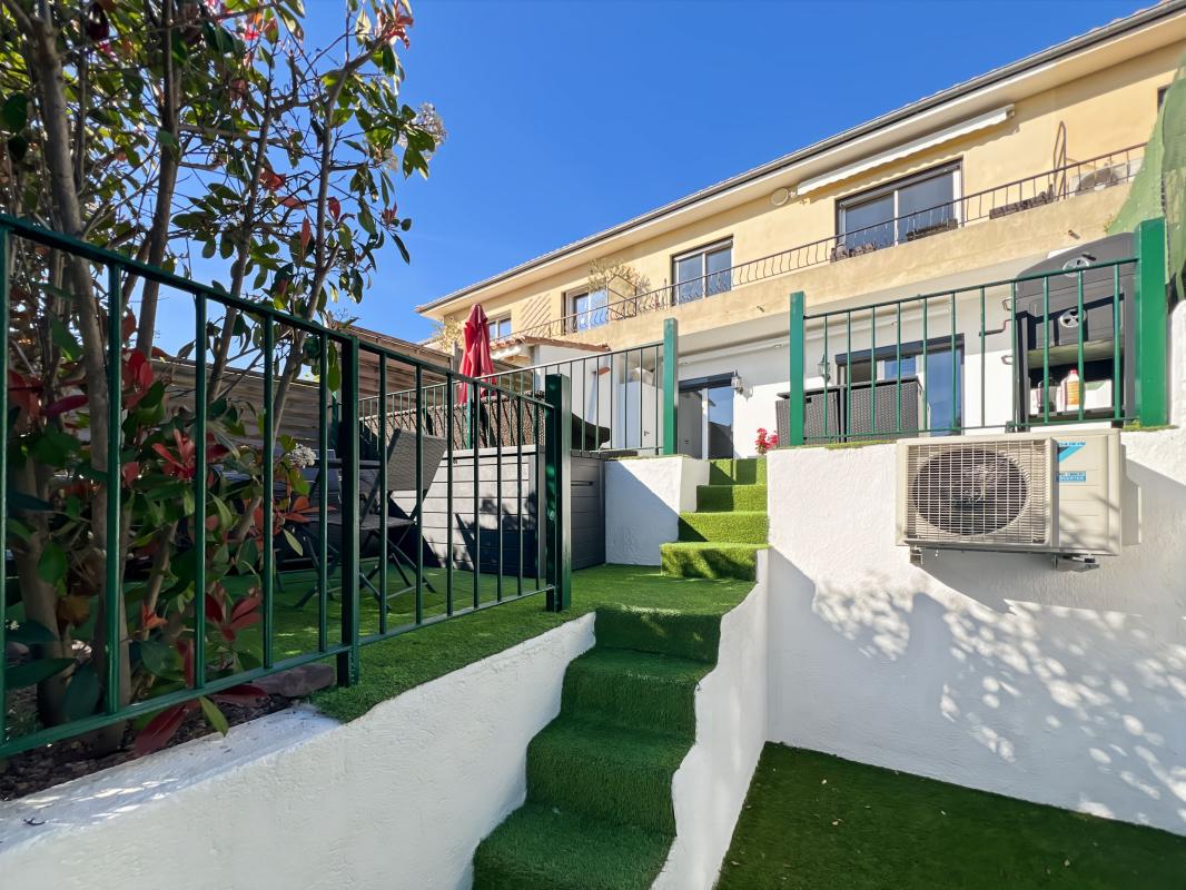 Secteur résidentiel au calme absolu avec aperçu mer. Dans une petite copropriété, charment 2 pièces de 40m² en RDC rénové avec entrée, salle d'eau, wc, chambre, cuisine ouverte sur séjour donnant sur grande terrasse de 60m² avec aperçu mer.