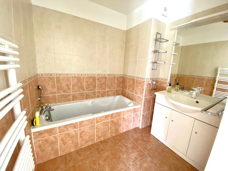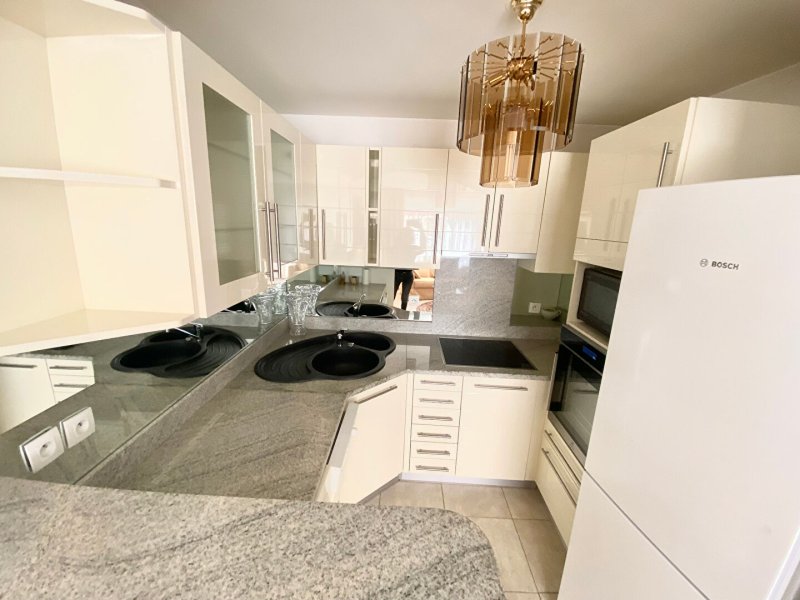 Séjour donnant sur une terrasse de 12 m², cuisine équipée aménagée,