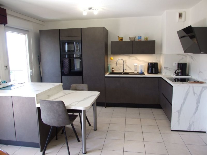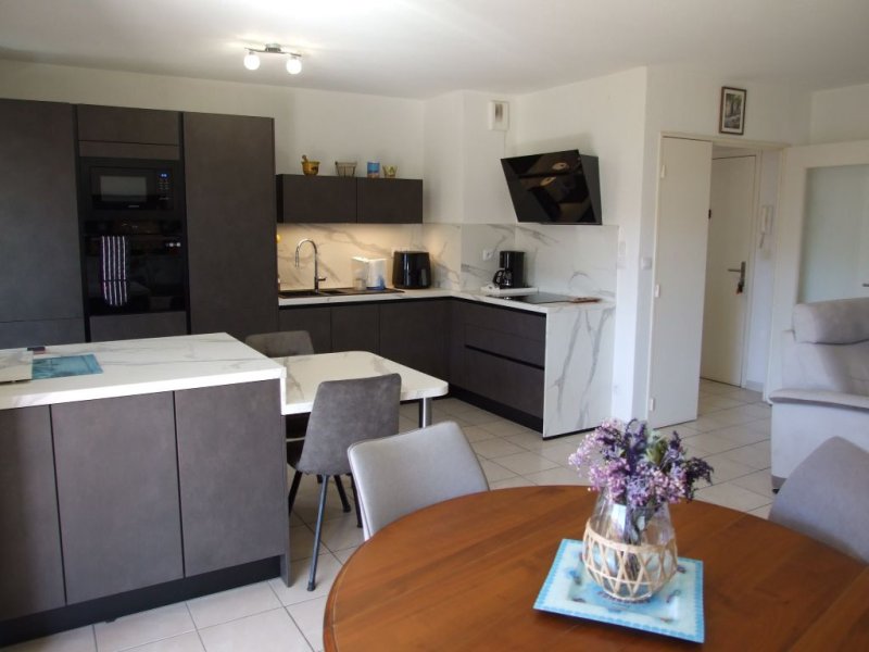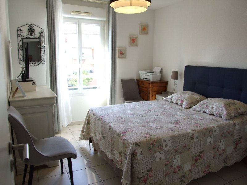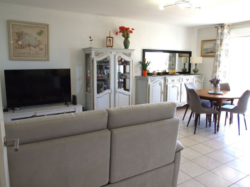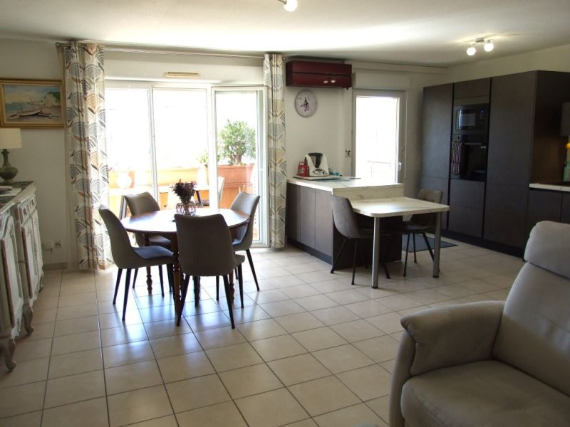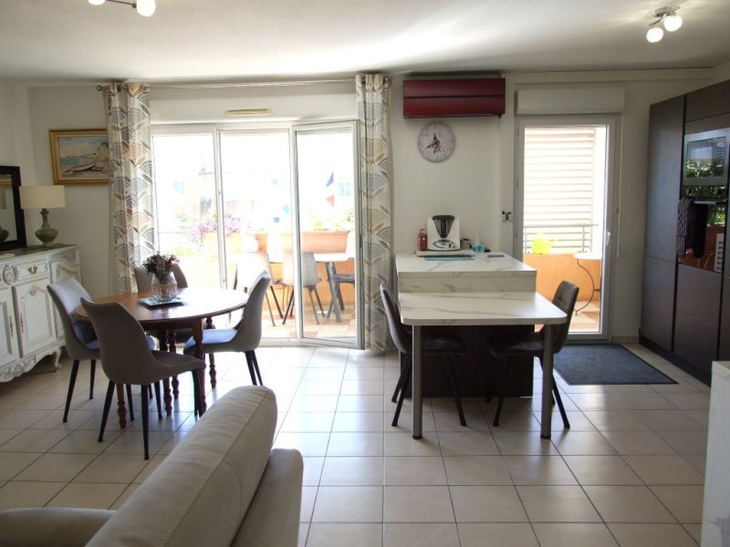 Bel appartement 3 pièces de 75 m2 avec terrasse de 14 m2 exposition Sud avec aperçu mer côté Ouest situé dans une résidence fermée de 2009 en étage avec ascenseur et en position dominante. Une entrée et un dégagement avec placard, un séjour avec cuisine américaine équipée (34 m2), deux chambres avec placard, une salle d'eau, un wc indépendant, un garage. (Climatisation réversible, double vitrage, volet roulant électrique dans le séjour, accès PMR...). Charges de copropriété : 1343 EUR/an eau froide incluse + Fonds de travaux Alur : 77 EUR/an.