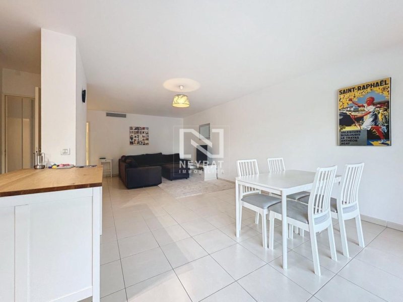Saint Raphaël Résidence les jardins de Jade, d'excellent standing, avec superbe piscine, Gardien, T3 sans vis à vis, au deuxième étage sur 3 avec ascenseur. Entrée avec placard, distribuant vaste salon de 32m² carrelé, donnant sur terrasse de 15,70m² expo Est/sud, avec cuisine semi-ouverte, entièrement équipée et aménagée; Cellier attenant, Espace nuit desservant 2 chambres ( chacune son grand placard) avec salle de bain, salle de douche, WC séparé avec lave-mains, Parking extérieur et grand garage en sous-sol