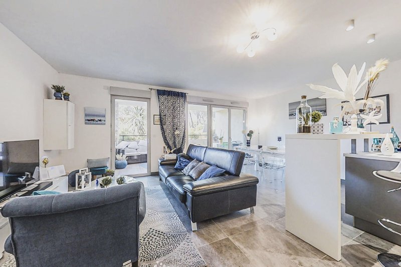 Saint-Raphaël Valescure, à proximité immédiate du golf: Beau T3 de 80 m2 dans résidence récente de standing, au grand calme avec vue sur la pinède. Proche des golfs, tennis, commerces. Vaste séjour avec cuisine américaine exposé Sud-Ouest et terrasse de 13 m2 sans aucun vis-à-vis . Salle de bain ou salle d'eau pour chacune des 2 chambres, 2 WC. Garage fermé avec cave aménagée + place de parking privative couverte.