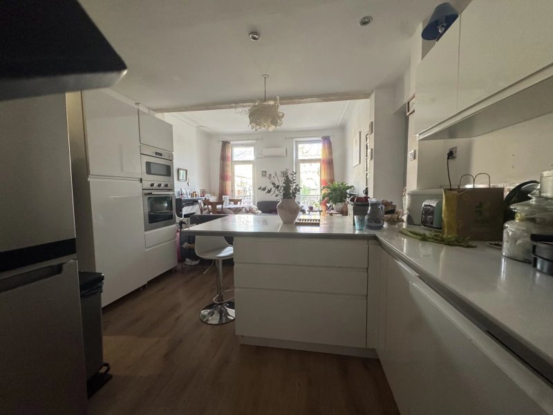 Étage 1 sans ascenseur, avec cave aménagée. 3 chambres climatisées avec rangement et un grand séjour avec cuisine ouverte. Balcon filant