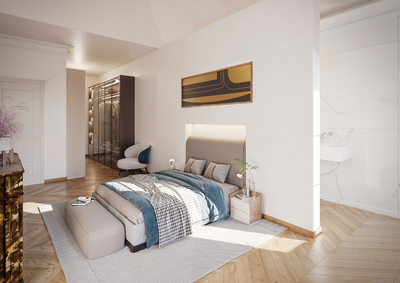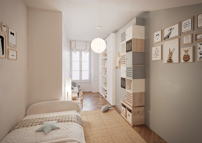 Ces perspectives traduisent un scénario d'optimisation architecturale et esthétique, mettant en valeur la structure haussmannienne, la luminosité naturelle et la possibilité d'un duplex de standing au coeur de la Place de la Liberté. Elles ne constituent ni un engagement contractuel ni une description de l'état actuel du bien, mais une illustration du potentiel de transformation.