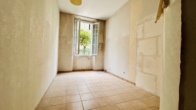 TOULON - PROCHE CENTRE VILLE / ST ROCH - Dans un immeuble bien entretenu située à proximité des commerces, du centre ville (facultés), et de la porte Castigneau. Appartement en rez-de-jardin de Type 2/3 de 52m2 composé d'un hall d'entrée desservant un espace de vie avec séjour et cuisine exposés à l'Ouest donnant sur terrasse et jardin de 70m2 et un atelier de 9m2 pouvant servir de stockage et de futur cuisine d'été. Le coin nuit dessert une grande chambre de 16m2 exposées à l'Est, une salle d'eau et wc séparé + Deux caves en sous-sol complètent le logement principal. Travaux à prévoir (sauf double vitrage)