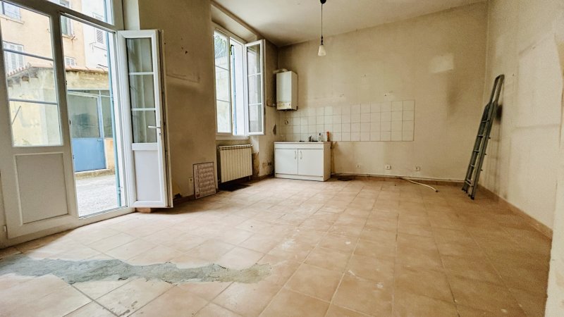 TOULON - PROCHE CENTRE VILLE / ST ROCH - Dans un immeuble bien entretenu située à proximité des commerces, du centre ville (facultés), et de la porte Castigneau. Appartement en rez-de-jardin de Type 3 de 58m2 composé d'un hall d'entrée desservant un espace de vie avec séjour et cuisine exposés à l'Ouest donnant sur terrasse et jardin de 36m2 et un atelier de 15m2 pouvant servir de stockage et de futur cuisine d'été. Le coin nuit dessert 2 chambres exposées à l'Est, une salle d'eau et wc séparé + Deux caves en sous-sol complètent le logement principal. Travaux à prévoir
