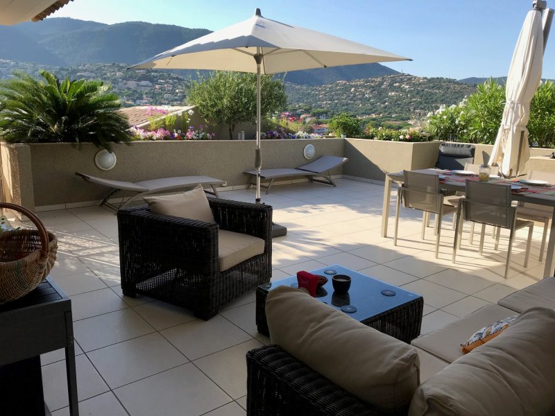 Situé au dernier étage d'une résidence de standing de 2011, à deux pas du centre-ville et des commodités, cet appartement traversant de type « villa sur le toit » se compose d'une pièce à vivre avec cuisine ouverte équipée, une chambre indépendante avec placard et salle d'eau/wc, un dégagement avec placard, desservant deux chambres, une salle d'eau et un wc, ainsi qu'un balcon de 18m² orienté sud-est. La généreuse hauteur sous plafond et les poutres apparentes confère au logement un caractère authentique et chaleureux. La terrasse principale, de 48 m², véritable prolongement de cet espace intérieur, offre une vue panoramique sur les collines. Climatisation réversible. Cave et garage en sous-sol de l'immeuble. Pour plus d'informations, merci de contacter Valérie Variclier au 06.80.66.43.47. Honoraires inclus de 6% TTC à la charge de l'acquéreur. Prix hors honoraires 1 000 000 . Dans une copropriété de 60 lots. Aucune procédure n'est en cours. Classe énergie B, Classe climat A Montant moyen estimé des dépenses annuelles d'énergie pour un usage standard, établi à partir des prix de l'énergie de l'année 2021 : entre 667.00 et 903.00 . Les informations sur les risques auxquels ce bien est exposé sont disponibles sur le site Géorisques : georisques.gouv.fr. Votre conseiller ISIMMO Locations Transactions Cavalaire : Conseillère en Immobilier - Valérie VARICLIER