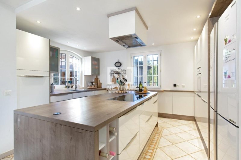 En rez-de-jardin : une superbe entrée sous porche et terrasse, un dégagement avec WC suspendu et lave-mains, un vaste salon avec espace bureau donnant sur l'extérieur, une belle cuisine ouverte avec salle à manger, donnant sur une grande terrasse couverte, un cellier / buanderie avec accès à la cave, une grande chambre avec salle de douche et WC.