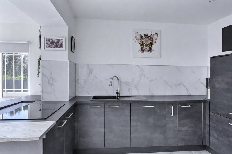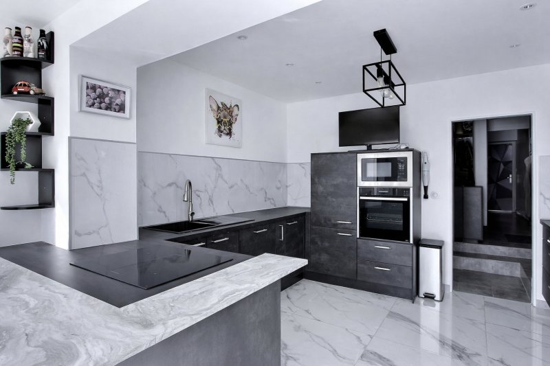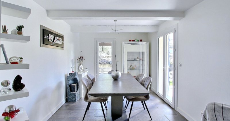 La seconde partie, plutôt destinée à une maison familiale de type T4, a été entièrement rénovée dans un style moderne et épuré, aux tonalités minérales béton, offrant une ambiance élégante et contemporaine. L'intérieur, en parfait état, propose un beau séjour lumineux avec mezzanine utilisée en chambre, un espace repas convivial et une cuisine dinatoire ouverte sur l'extérieur, donnant directement sur la terrasse et l'espace piscine. L'espace nuit se compose d'une suite parentale, d'une seconde salle d'eau ainsi que d'une chambre supplémentaire.