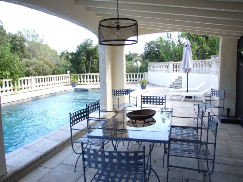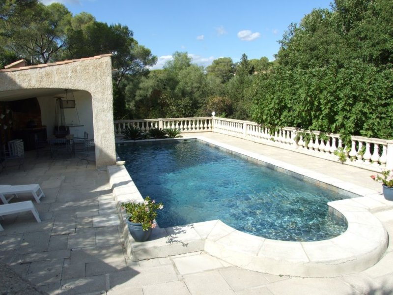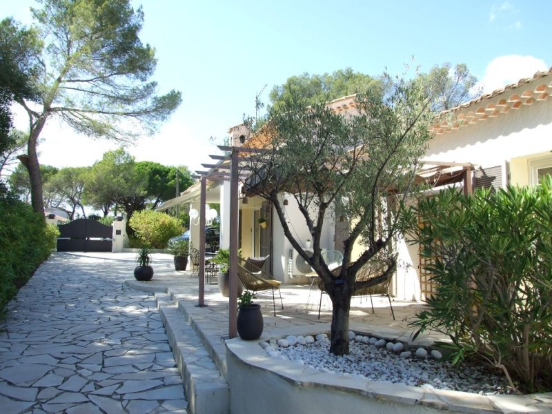 Très belle propriété dominante composée de 2 villas mitoyennes communiquantes sur terrain arboré de 1620 m2 avec picine et pool-house située dans le secteur de la Tour de Mare au calme, sans vis-à-vis avec vue sur la pinède. La villa principale d'environ 150 m2 est composée au rez-de-chaussée d'un vaste séjour salon (clim. réversible) avec cheminée et cuisine américaine équipée, d'une salle d'eau avec wc, d'un dressing et à l'étage, d'une mezzanine, trois chambres, un dressing, une salle de bain, un wc indépendant. La seconde villa d'environ 80 m2 entièrement rénovée est composée d'un séjour avec cuisine américaine équipée, deux chambres avec placard, une salle d'eau, un wc indépendant. (climatisation réversible, double vitrage, volets roulants électrique). Une cave, un abris bois, plusieurs stationnements à l'intérieur de la propriété avec accès par le portail automatique viennent compléter votre future résidence.