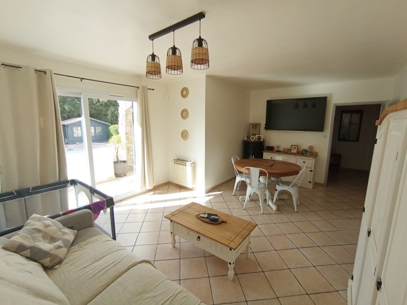 Garéoult dans un quartier résidentiel, nous vous proposons très belle maison individuelle avec garage et piscine exposée sud de 128m2 sur terrain plat de 1565 m2. A seulement 10 minutes à pied du village, cette propriété offre un cadre de vie exceptionnel au calme absolu. Elle se compose : au rez-de-chaussée d'un hall d'entrée, une cuisine indépendante entièrement équipée et aménagée, un beau salon séjour lumineux ouvert sur une vaste terrasse plein sud, deux belles chambres, une salle d'eau et un WC indépendant. À l'étage, une chambre mansardée avec sa salle de bain privative et WC, et un grand espace pouvant être aménagé en chambre, bureau ou salle de loisirs. Le tout étant alimenté avec climatisation réversible et par pompe à chaleur air/eau offrant un réel confort et des économies d'énergie au quotidien. À l'extérieur, vous profiterez d'une agréable piscine Desjoyaux 8X4 avec pool house propice à la détente, un jardin soigné avec chalet de 12 m2 avec parquet flottant et VMC, un carport pouvant accueillir deux véhicules.