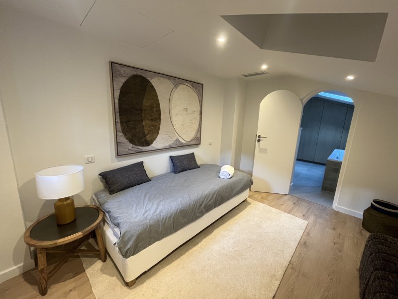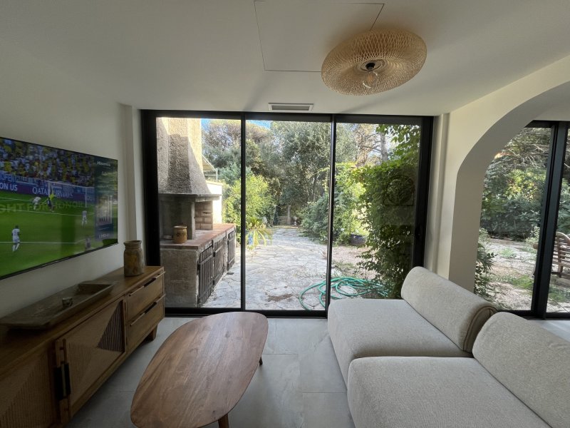 Au sein d'une résidence sécurisée avec gardien, découvrez cette maison mitoyenne d'un côté entièrement rénovée avec goût de 92m2 habitable environ (dont 59.17m2 en loi Carrez). Elle se compose au rez-de-chaussée d'une entrée, d'une cuisine équipée ouverte sur salon/séjour donnant sur la terrasse, 1 chambre, une seconde chambre 'partie du salon', un WC séparé, une salle d'eau et un coin buanderie. A l'étage, une chambre, une salle de bain avec WC. Deux places de stationnement complète la maison. Grand jardin de 300m2 piscinable.