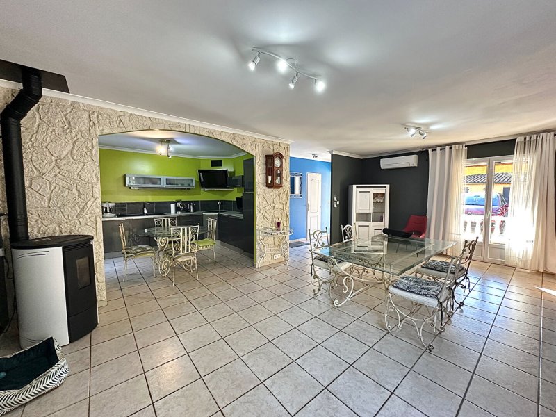 De plain-pied, cette villa vous offre 3 chambres, une pièce à vivre exposée plein sud, une cuisine équipée et aménagée avec son cellier et une salle de bain avec douche et baignoire.