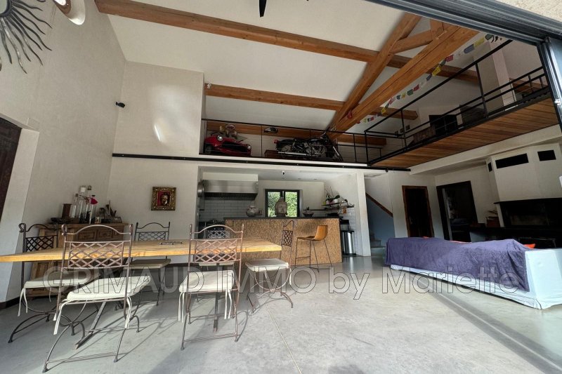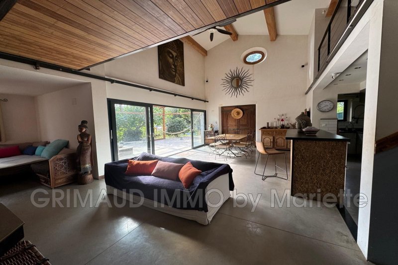 À pied du village de Grimaud, au calme, cette maison de campagne de plain-pied s'étend sur 360 m², au coeur d'un parc arboré de 1,5 hectare. Elle se compose d'un grand séjour avec poutres apparentes, d'une cuisine ouverte, de deux chambres partageant une salle de douches, ainsi que d'une mezzanine aménagée en suite avec salle d'eau, dressing et terrasse tropézienne. Un garage/buanderie complète la partie principale. Quatre chambres indépendantes avec leurs salles de bains et une cuisine séparée permettent une activité de chambres d'hôtes ou de location saisonnière, facilitée par deux entrées distinctes.