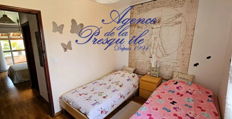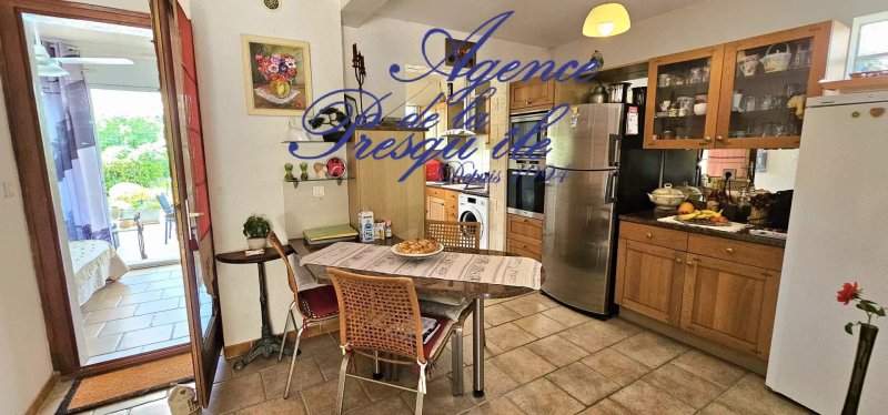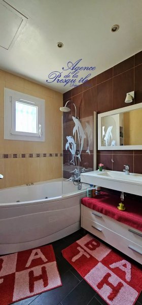 A 1km de la Plage et du Village, avec un environnement piscine vert et tranquille, cette maison se compose sur deux niveaux d'un salon séjour cuisine, deux salles de bains wc, 3 chambres, une grande véranda (28m²), 2 terrasses. Possibilité de garer deux voitures. Une grande cave. Un chalet de Jardin.
