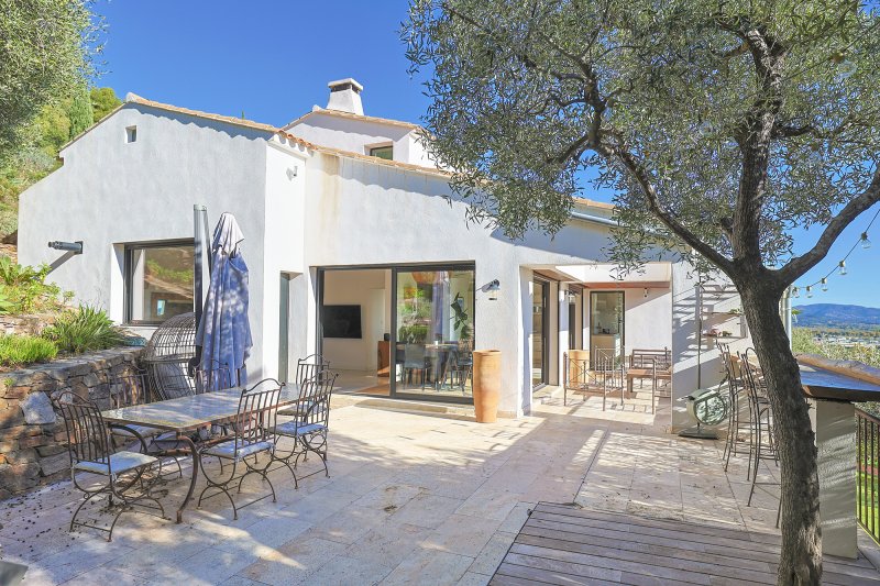 Hyères dans un secteur résidentiel au calme, superbe rénovation pour cette villa de 221m2 offrant une très belle vue mer dominante à couper le souffle et son jardin arboré de 2293 m2. Edifiée sur un terrain paysager, cette propriété se distingue par la qualité de ses prestations. Dès l'entrée un vaste salon séjour, avec une belle hauteur sous plafond, offre la mer en ligne de mire. Que ce soit du salon ou bien de la cuisine semi ouverte, vous accéderez à une belle et large terrasse qui invite à la détente et la contemplation. Elle offre 4 chambres dont une suite parentale de plain pied avec salle d'eau et une salle de bains pour les deux autres chambres. La 4ème chambre bénéficie elle d'un petit bureau avec le vide sur séjour faisant le lien avec le salon. En rez de jardin un appartement de type T3 complète la partie vie, idéale pour accueillir ou générer un revenu locatif. Le terrain de 2293 m2 est entièrement arboré et sans vis à vis, mais surtout il offre une très belle vue sur la verdure et la mer. Un garage de rangement complète ce jardin où vous pourrez stationner les voitures également. La situation géographique de ce bien non loin des plages de l'Almanarre et au calme lui confère de sérieux atouts.
